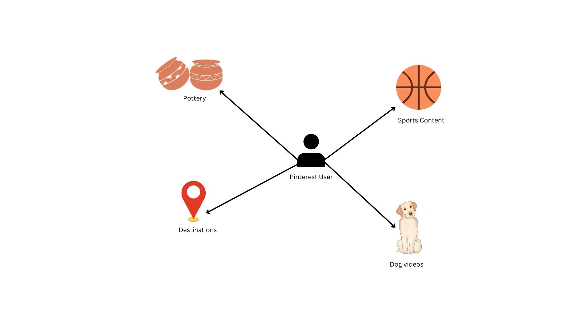 While the illustration above is a simplified representation of a true production graph, it accurately reflects the complex relationships we can model. In this structure, users and content categories act as nodes, and interactions form edges that link them. Every time a user engages with a pin, they create a new edge between themselves and that object’s category. Importantly, these edges are dynamic: as engagement with a specific category increases, the weight of that edge grows, meaning a stronger connection between the user and that interest.