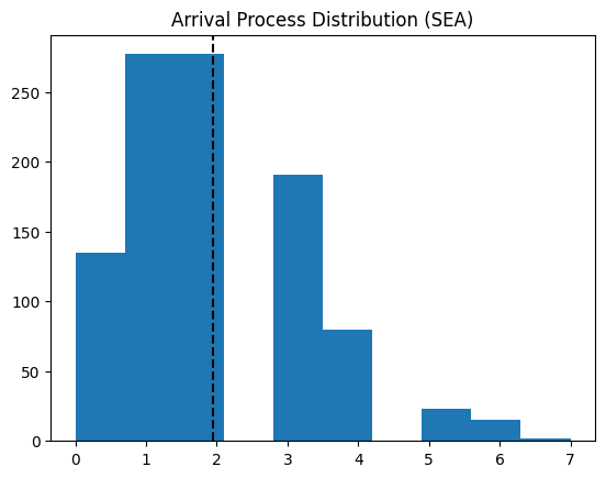 From the previous section, we learned B (defined as our CT) and C (4 self-checkout stations). We must now identify A. Let \(\lambda\) denote the average arrival rate of customers. In the context of our problem, we will suppose \(\lambda\) to be the average arrival rate during our peak hours (since slow hours do not tend to have any kind of queue). The arrival distribution (which we model as a poisson distribution) is shown below in Figure 3.2.