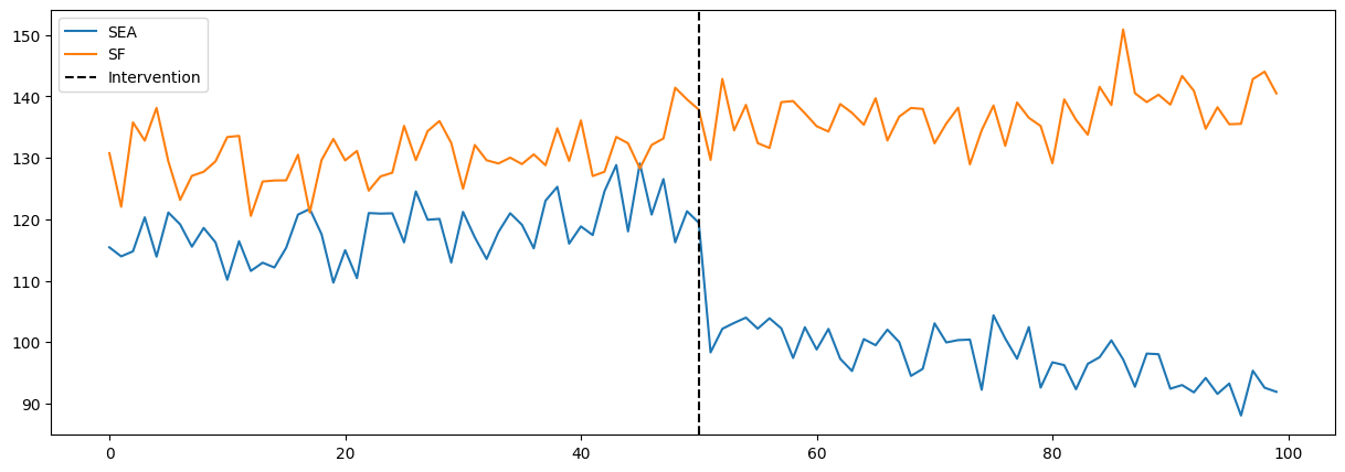 Since we’ve now established how we can model our problem using DiD, we can now get into the results of our model. As stated previously, Seattle is the location our treatment (i.e. implementing scanner guns for check-outs). From previous analysis, we believe a good control candidate that follows our DiD assumptions would be San Francisco (SF). We collected data over 100 days from both locations. At the 50 day mark, we rolled out the scanner guns in Seattle. Figure 4.1 shows the data we collected over time at both SEA and SF.